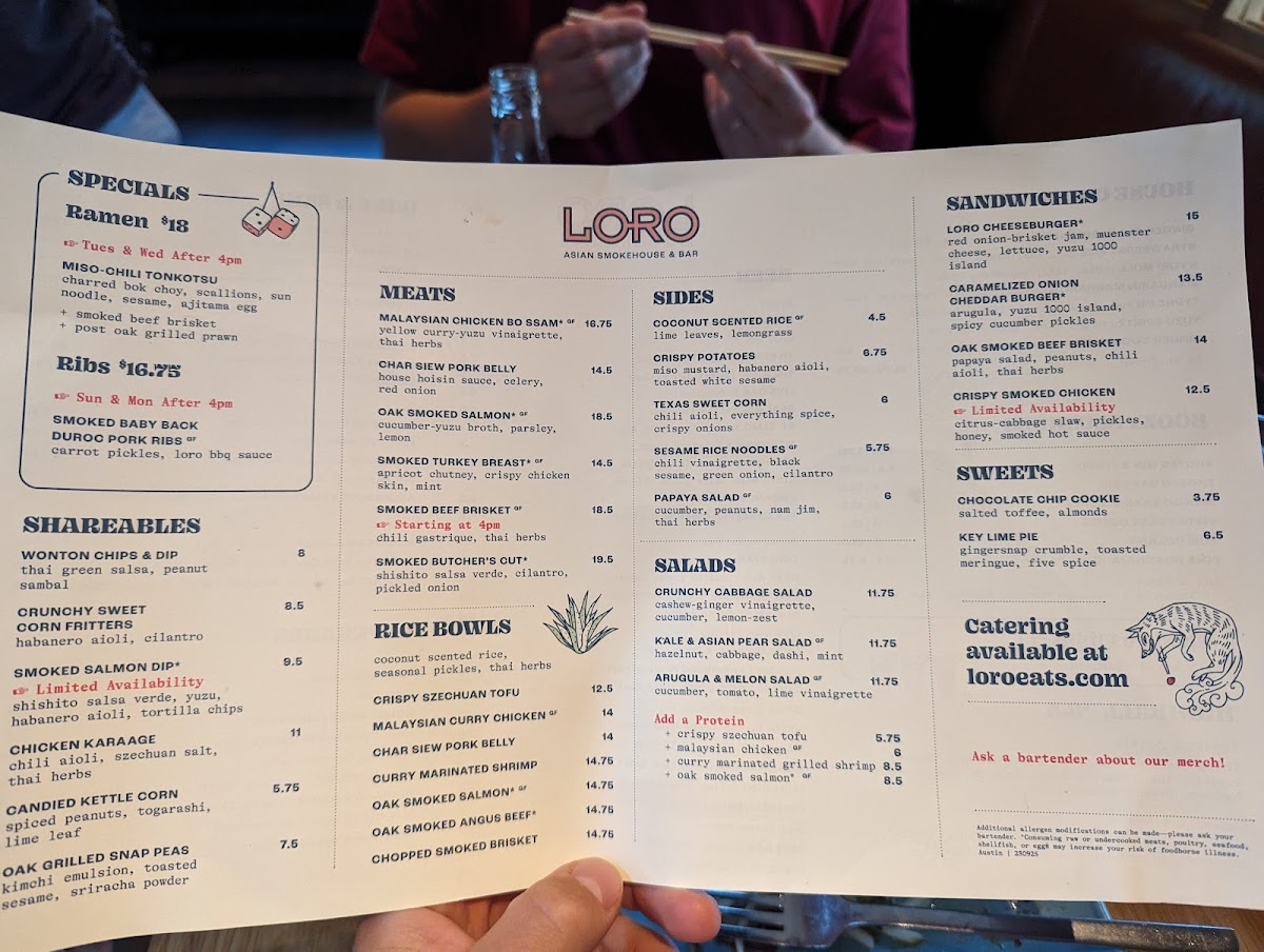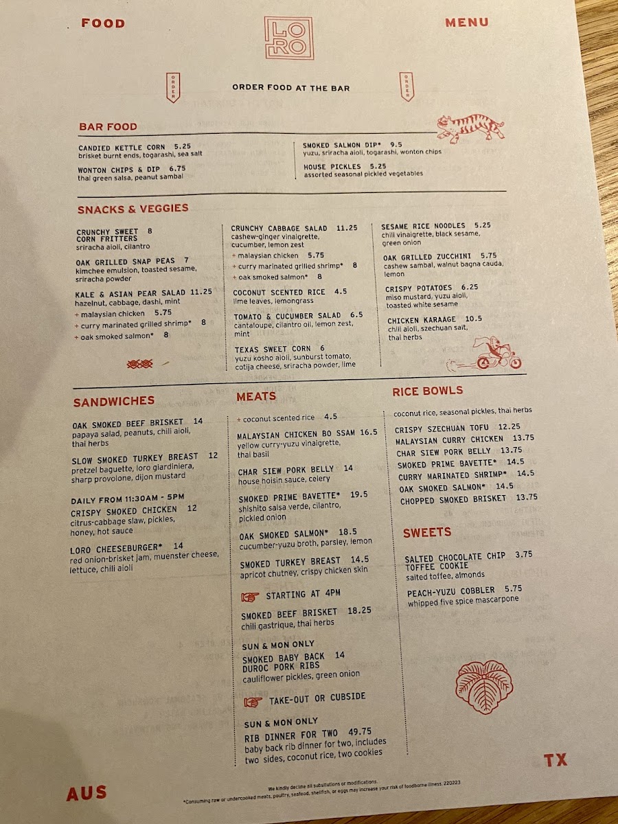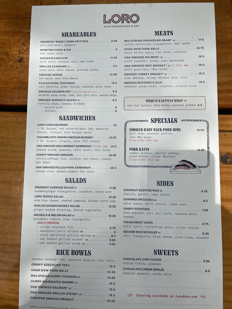 Finally tried Loro for the first time this weekend after having it on our list for a while. Overall we had a great experience. Really liked the casual vibe and the large amount of outdoor seating. We tried several things on the menu and enjoyed it all. Definitely some unique items that I don’t think you can get anywhere else in Austin. Definitely give it a try.