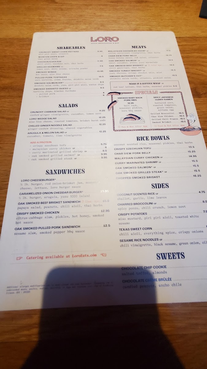 Loro's menu is a captivating journey through a spectrum of flavors. Start your culinary adventure with the Smoked Butcher's Cut, a tender steak that bursts with flavor, enhanced perfectly by shishito salsa and pickled onions. Or explore the Chicken Karaage, served with a crispy exterior that gives way to juicy, seasoned chicken—every bite is comfort food at its finest. The Pork Belly Rice Bowl is another must-try, showcasing smoky, succulent pork paired with hearty rice, delivering comfort in a bowl.