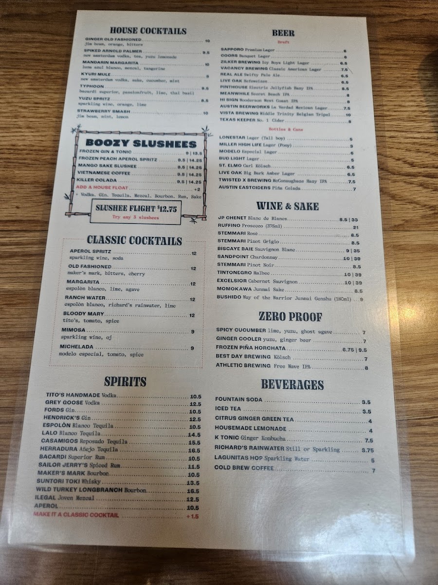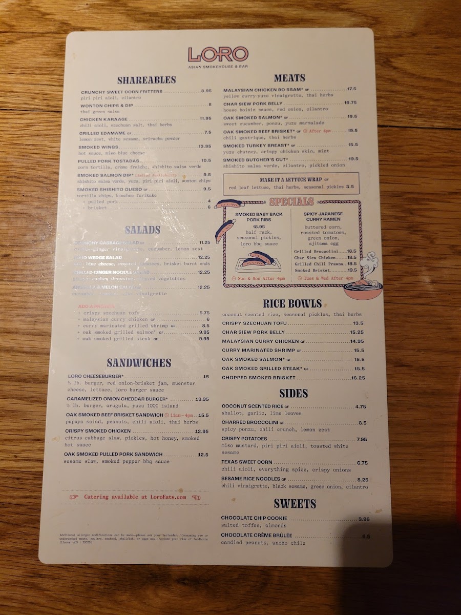 The Food is good, the sides are all especially good and exciting, the potatoes were soooo good and the rice noodles were filling and tasteful with the chili oil. The appetizers were also great, the queso and the wontons were delicious and added so much! Where it kinda went downhill was the pork katsu with noodles available one Mondays and Tuesdays. The dish was dry both the noodles and the pork katsu which is usually balanced with a tonkatsu sauce which wasn’t provided. The Charsiu was o k, it was more of a hoisin than a char siu flavor. Overall the atmosphere was great and we loved the experience! There was one service issue where we got boozy coffee when we asked for the traditional Vietnamese iced coffee. If I had only gotten the katsu I would have given Loro a 2.