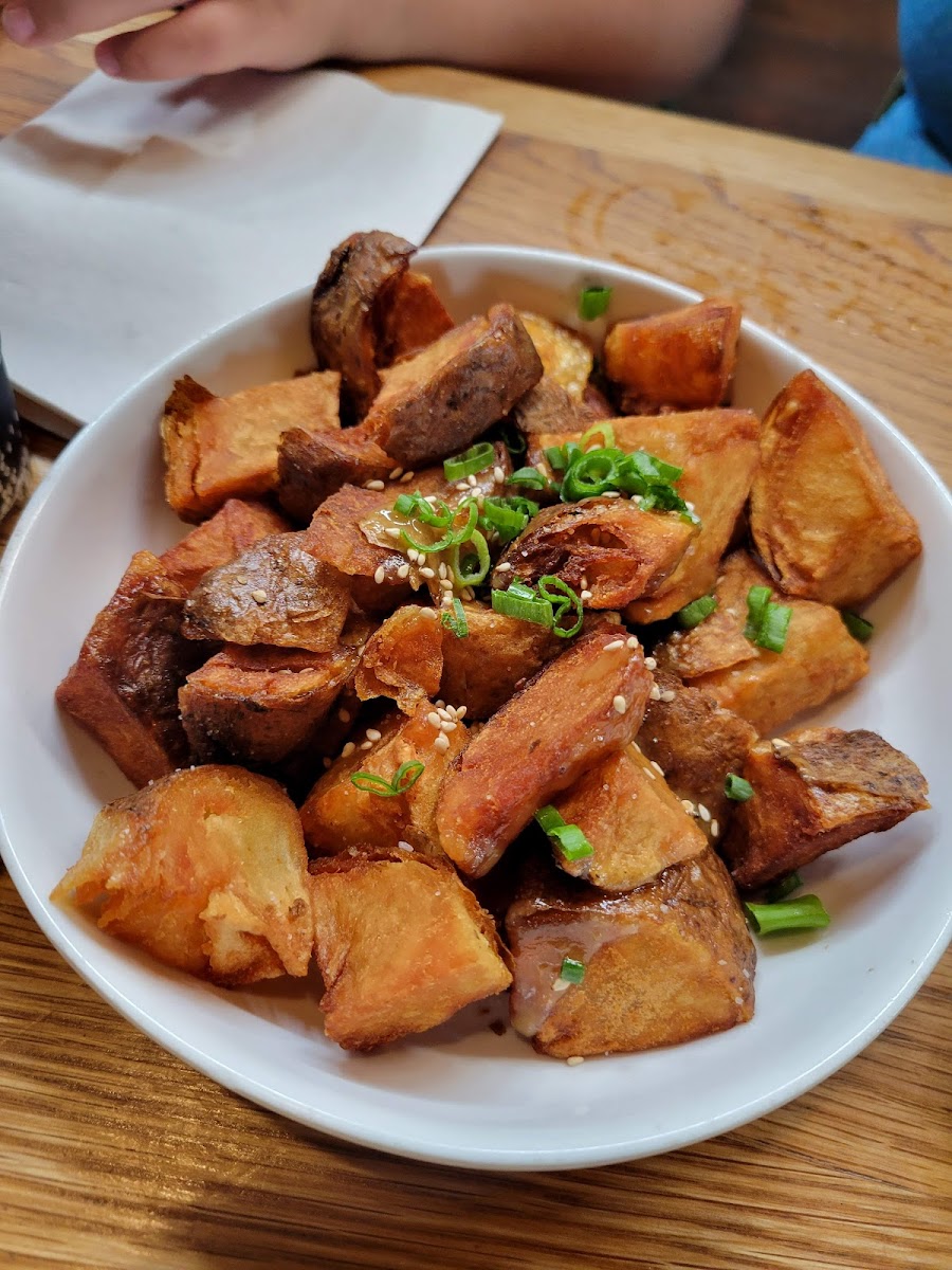 chili aioli, everything spice, crispy onions // contains dairy, egg, soy, garlic, and sesame